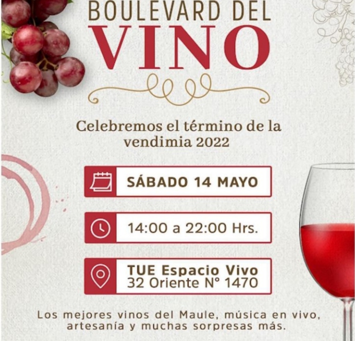 A Prefeitura de Talca, através da sua Corporação Municipal de Cultura, juntamente com a A.G. Ruta del Vino Valle del Maule e a TUE Espacio Vivo, realizará este sábado, 14 de maio, um dos eventos vitivinícolas mais emblemáticos da cidade: El Boulevard del Vino.